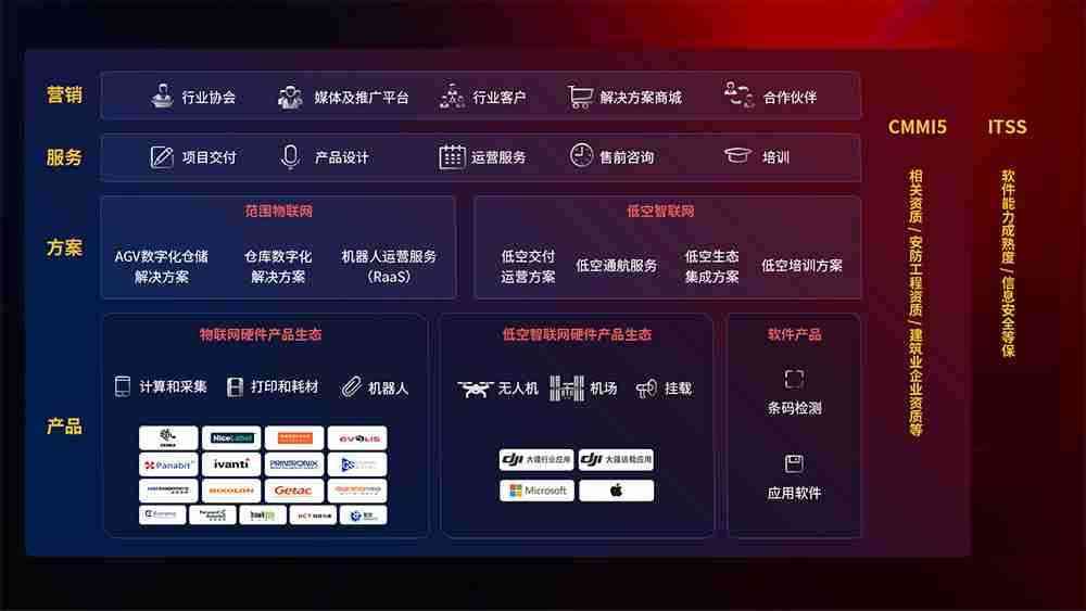 聚合国内外先进的物联网硬件产品品牌,,,聚焦数字化仓储、、、机器人运营、、、、低空智联网等领域,,,,共同打造适合客户业务场景的解决方案并提供交付服务